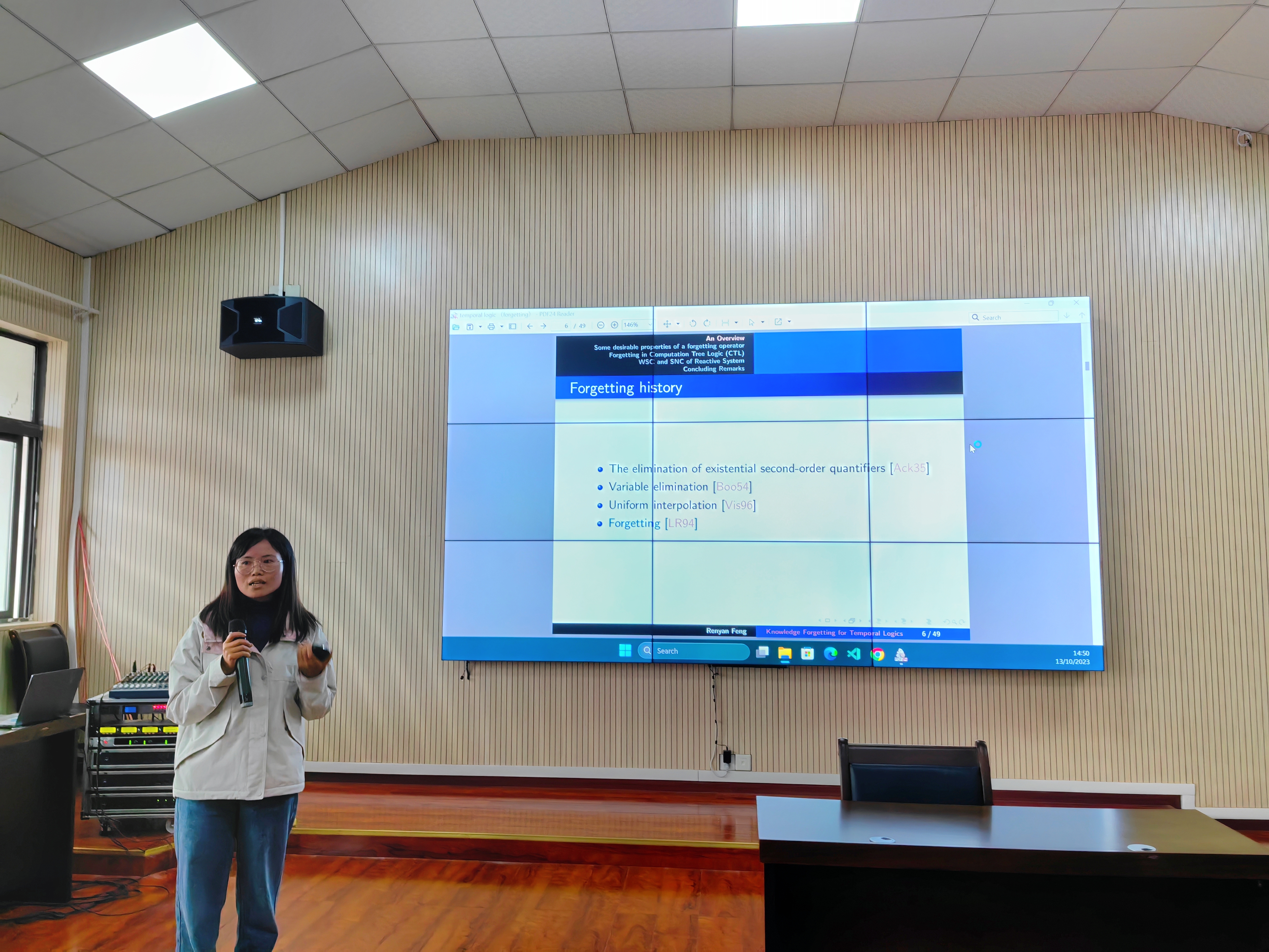冯仁艳博士为同学们开展了名为“时序逻辑遗忘理论(初识)”的讲座。遗忘和记住是人类两个最基本的大脑活动。在人工智能中,探索机器如何遗忘是长期以来的重要问题。冯仁艳博士围绕此话题,从一个简单的例子出发,逐步解锁遗忘的历史来源、应用领域、遗忘结果希望保持的性质、含有时序词情形下的遗忘理论及其在反应式系统中的应用。