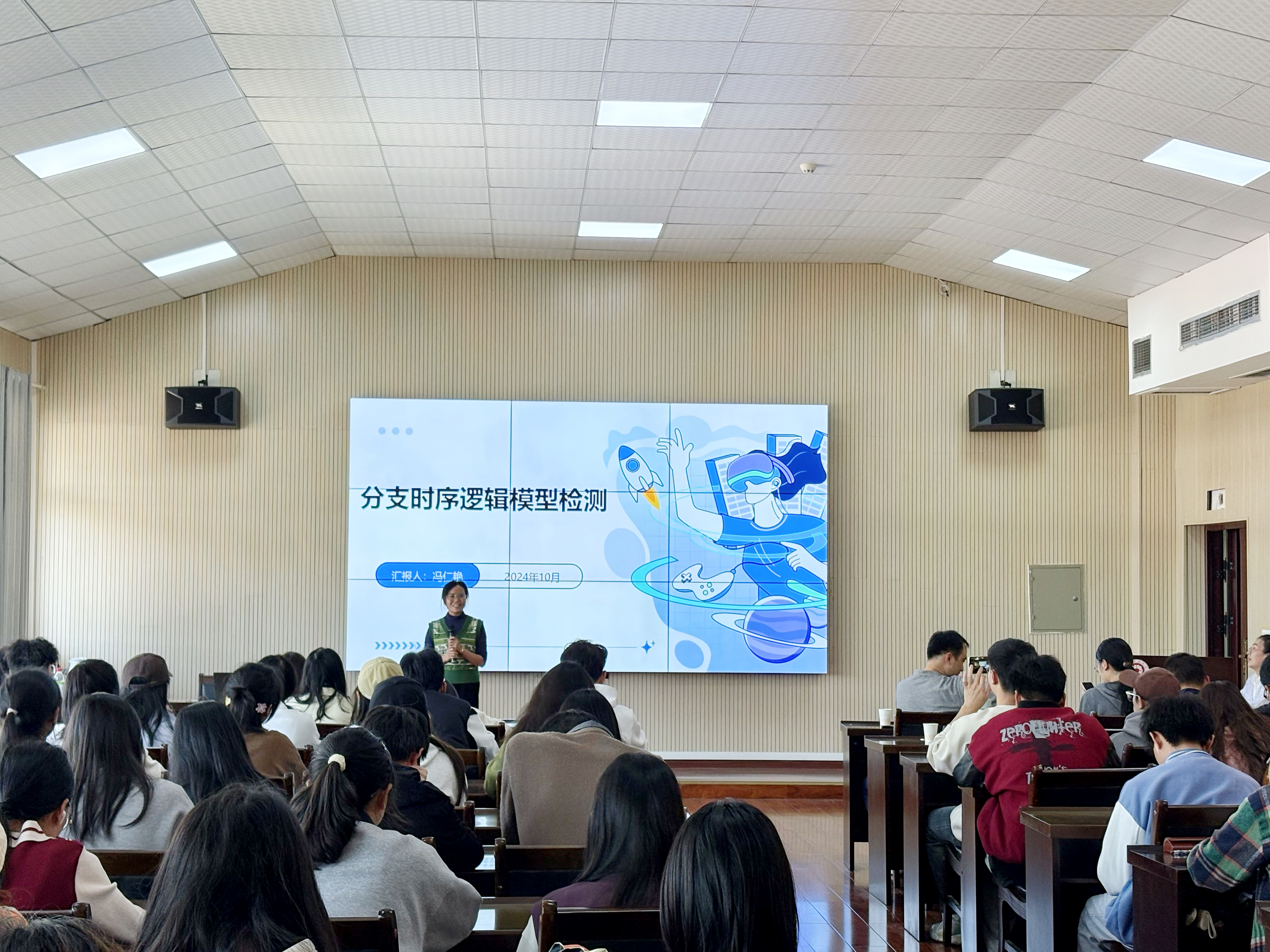 冯仁艳博士以“分支时序逻辑模型检测”为主题进行报告,系统地介绍了分支时序逻辑(Branching Time Temporal Logic, CTL)的基本概念及其在形式化验证领域的应用。冯仁艳博士通过对CTL的详细介绍,帮助同学们更好地理解了其在系统验证中的作用。