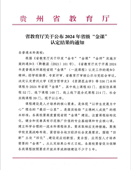 本网讯:(王游滨 图文报道)近日,贵州省教育厅公布了《2024年省级“金课”认定结果的通知》,公司4门课程获得认定。