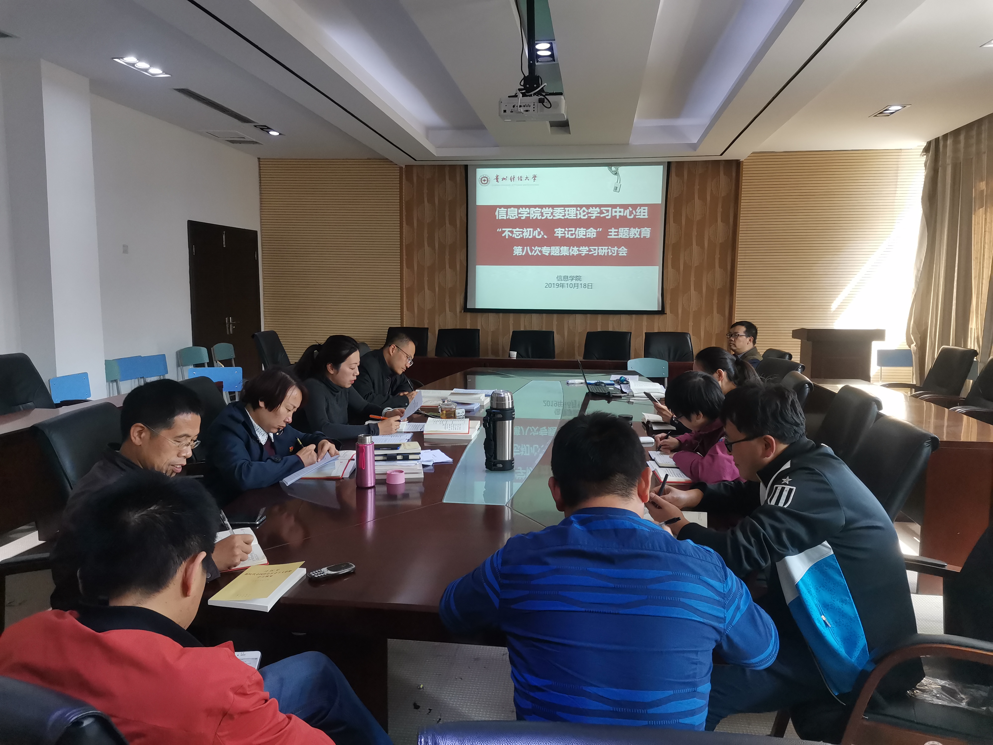 信息公司党委理论学习中心组于10月18日下午一点在志学楼427会议室理论学习中心组召开“不忘初心、牢记使命”主题教育第八次专题集体学习研讨会,公司领导、各系(科室)负责人、党支部书记参会,卿春主持会议。