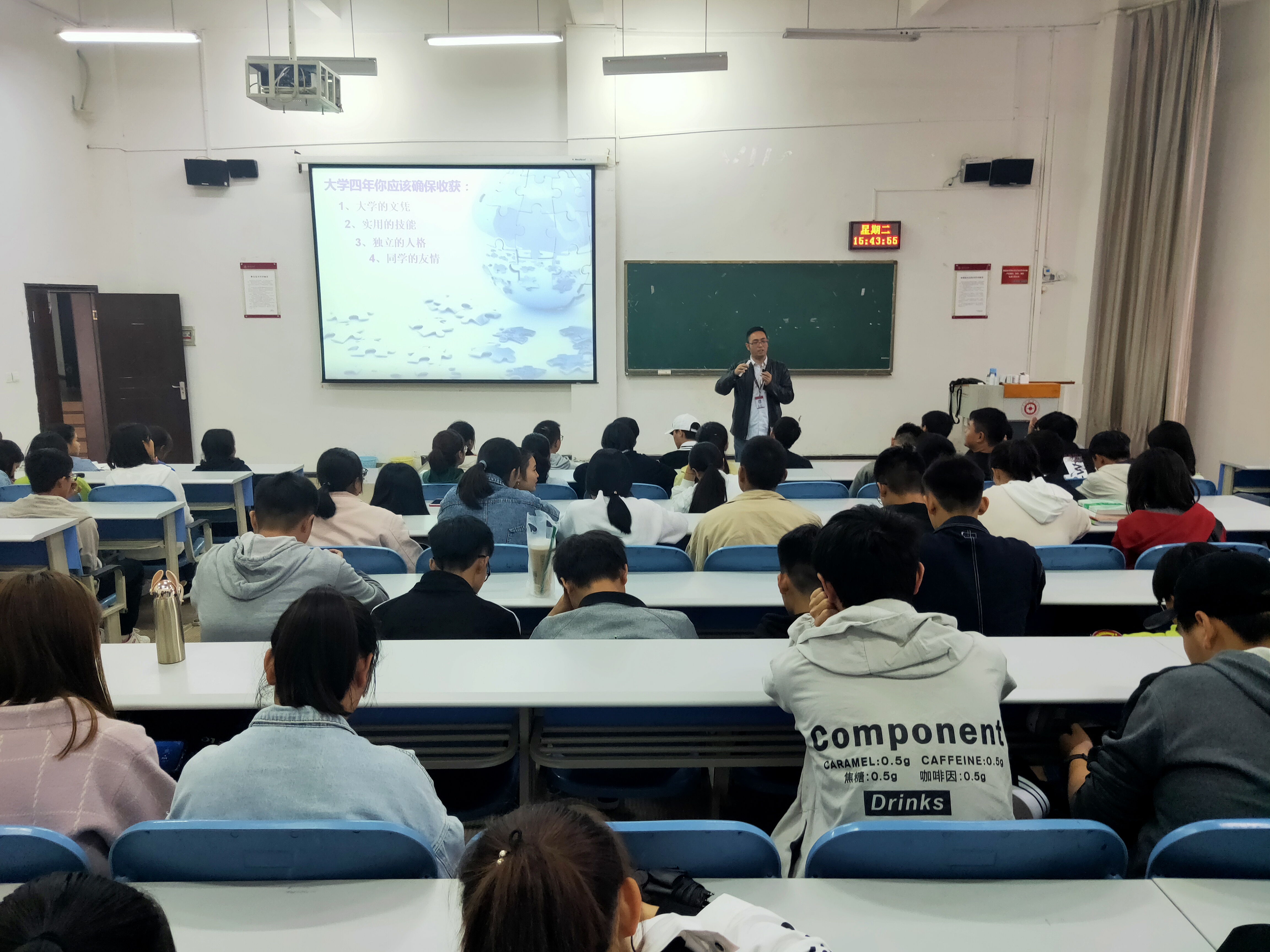 郑传行教授通过自身经历阐明职业生涯规划的重要性,引导同学们寻找自己的职业定位。通过分析当下就业形势指导同学们如何规划老员工活。同时强调在一生当中选择的重要性, 相同的公司、相似的出身,有的人成功了有的人却失败了,这在于选择的不同。最后强调,大学不是“游乐场”,同学们应该找到适合自己的学习方法,参与不同的社会实践,规划好自己的老员工活,努力为实现自己的目标而不懈奋斗。