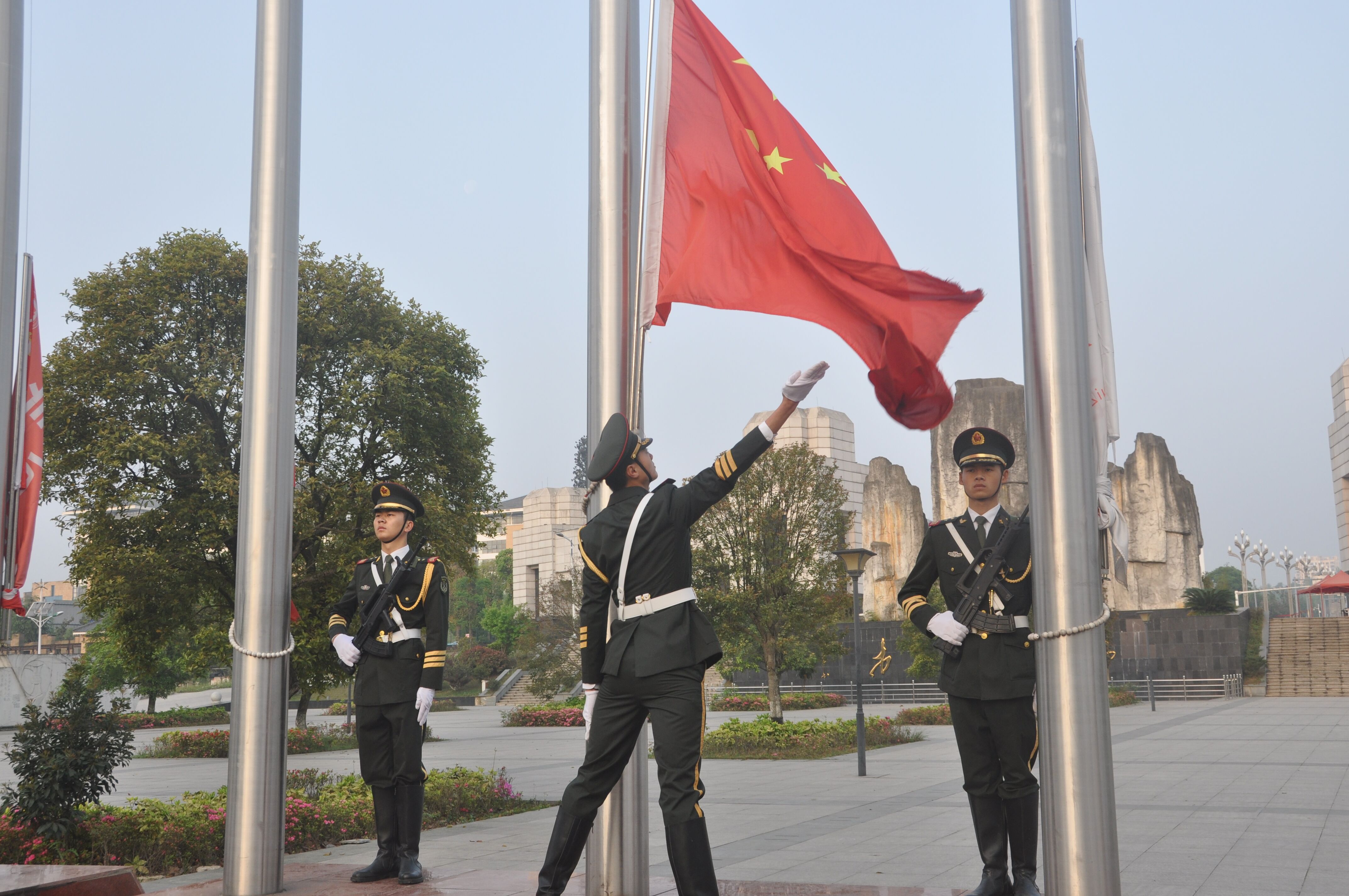 伴随着嘹亮的军乐声,国旗护卫队队员迈着整齐的步伐缓缓护送国旗进场,升旗仪式正式开始。伴随着国歌《义勇军进行曲》的响起,全体师生行注目礼,齐唱国歌,庄严肃穆。