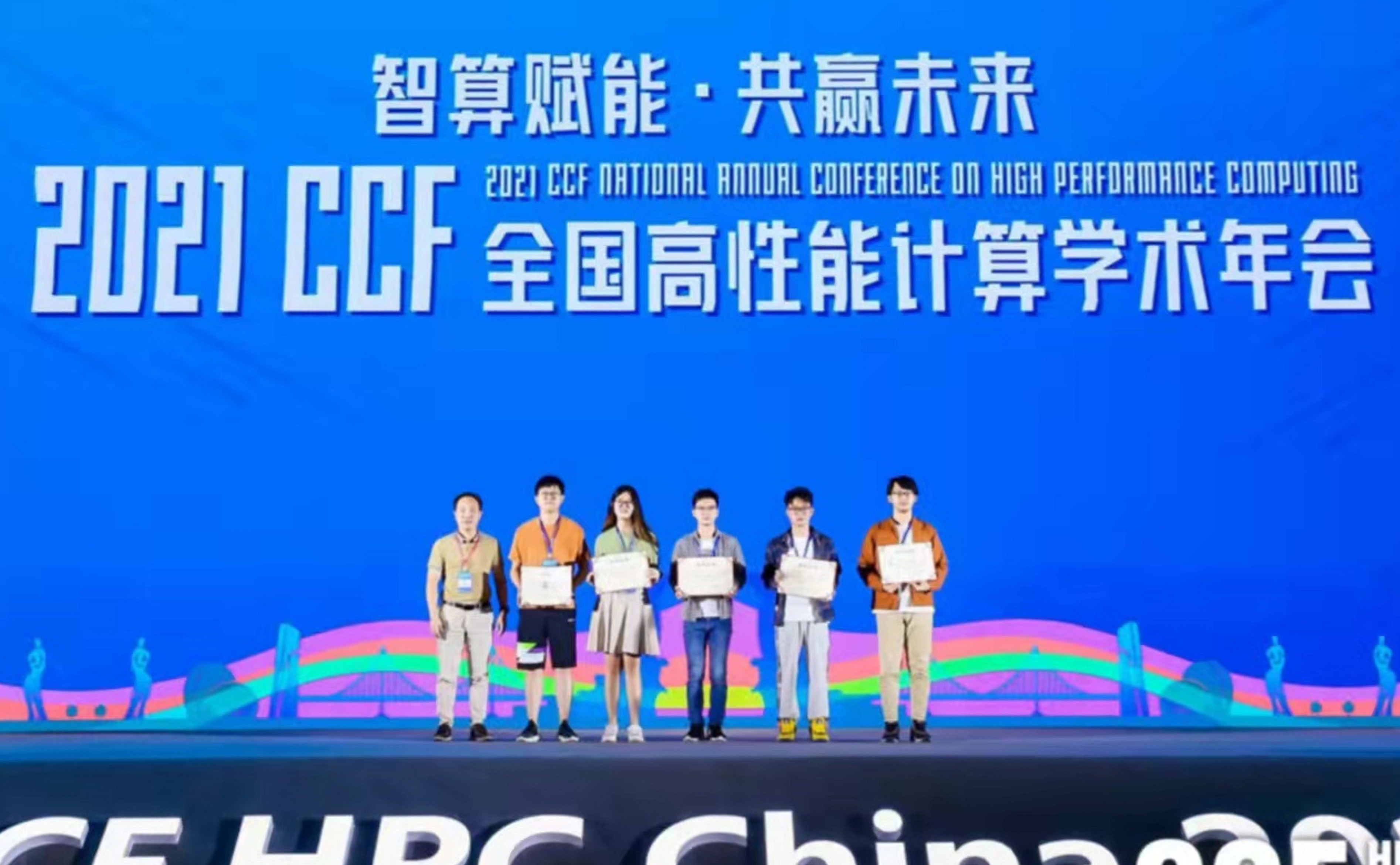 由邓明森教授带队参加年会,研究生公佐权、赵翔、牟明任分别进行了论文报告,引起了与会同行的兴趣。其中,赵翔同学撰写的论文作为15篇大会优秀候选论文之一,经投票等环节作为5篇论文之一获得了2021年全国高性能计算学术年会优秀论文奖。