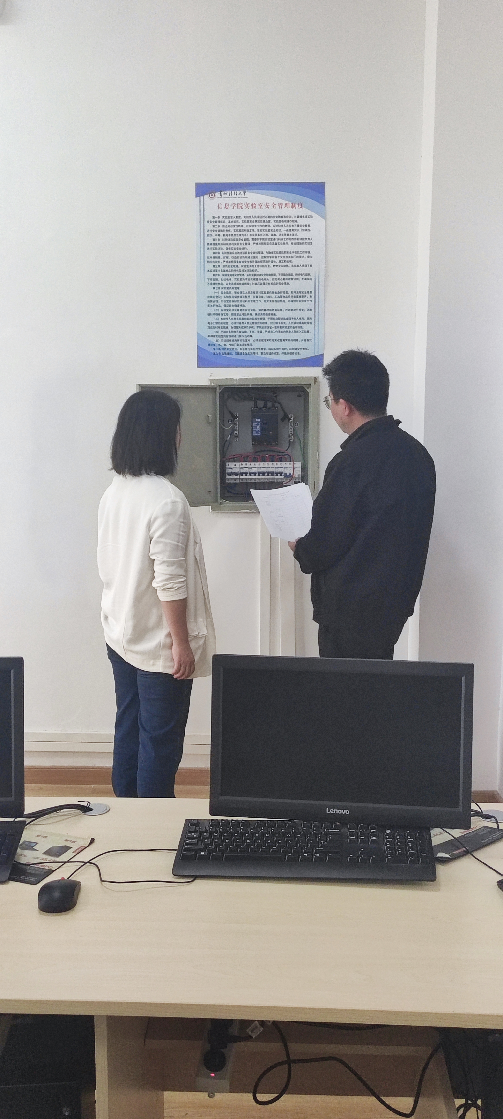 本网讯:(张骏 图文报道)3月22日下午,3044永利集团副经理梁敏及公司实验室负责人对公司网络实验室、硬件实验室、PLC实验室进行了安全常规检查,重点对各实验室的消防设施配备、水电管网布线等进行了排查,查找潜在安全隐患,现场商议后续整改措施。梁敏强调,要进一步加强规范管理,杜绝各风险点的安全隐患,确保实验教学正常运行。