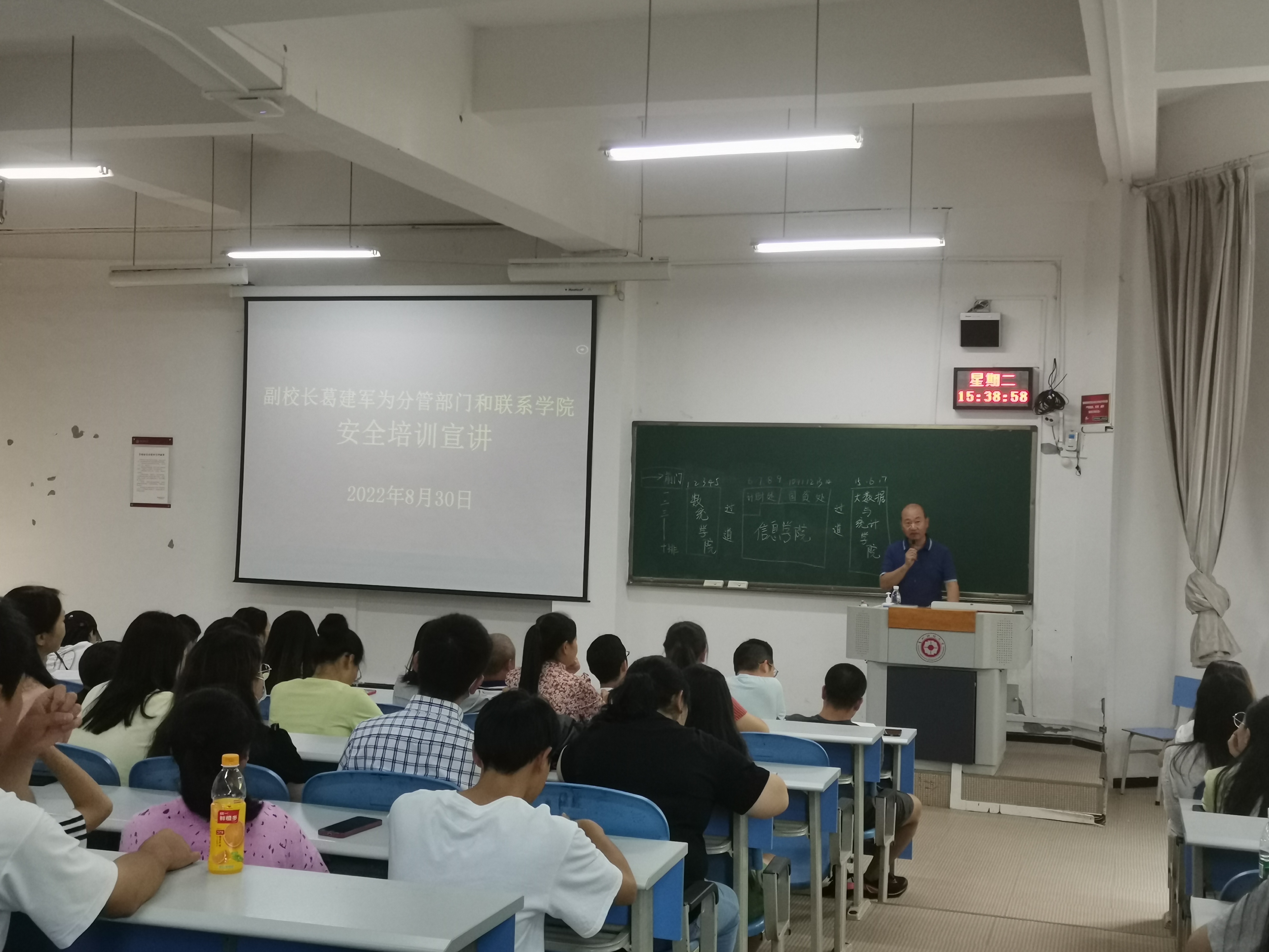 本网讯:(王游滨 图文报道)8月30日下午,公司党委委员、副董事长葛建军在进学楼1-1为分管部门和联系公司作安全培训宣讲,信息公司党委书记卿春主持。计划财务处、国有资产管理处、3044永利集团、数学与统计公司、大数据统计公司全体教职工和员工代表共260余人参加。