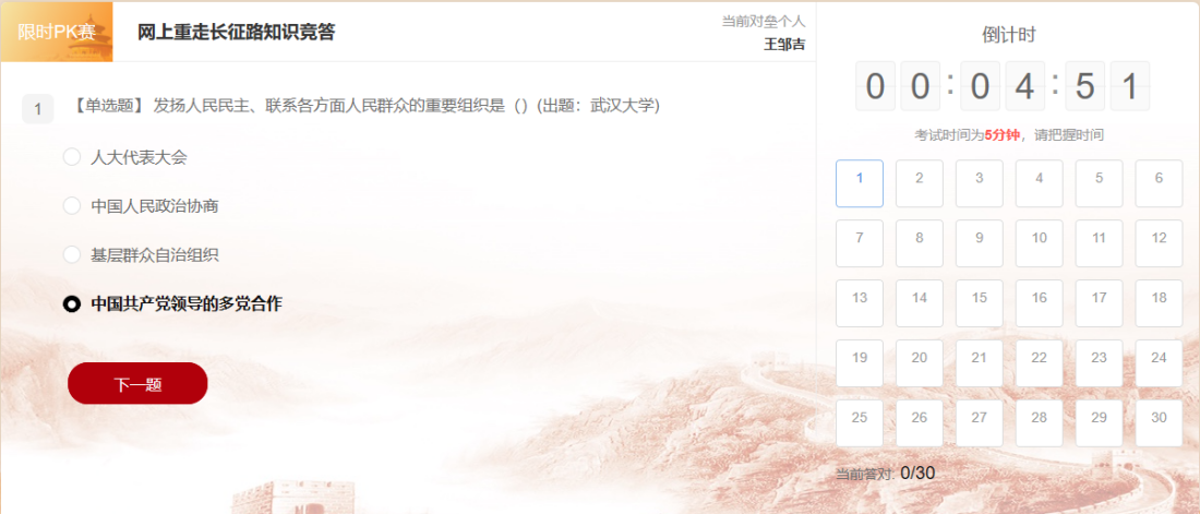 2.PK模式:选手选择限时赛或抢十赛后,由系统随机匹配对应省份参与PK模式答题的对手。限时赛为双方在3分钟内,答题数量多者胜,最多30题。抢十赛为双方在3分钟内,先答对10题为胜。PK胜利获得30积分,计入个人积分和高校积分中。