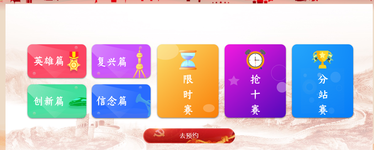 每日答题:选择英雄篇、复兴篇、创新篇、信念篇答题,系统按内容随机出20道题,限时10分钟,每题1分,根据选手答对的题数进行积分,分数计入个人积分和公司积分中。